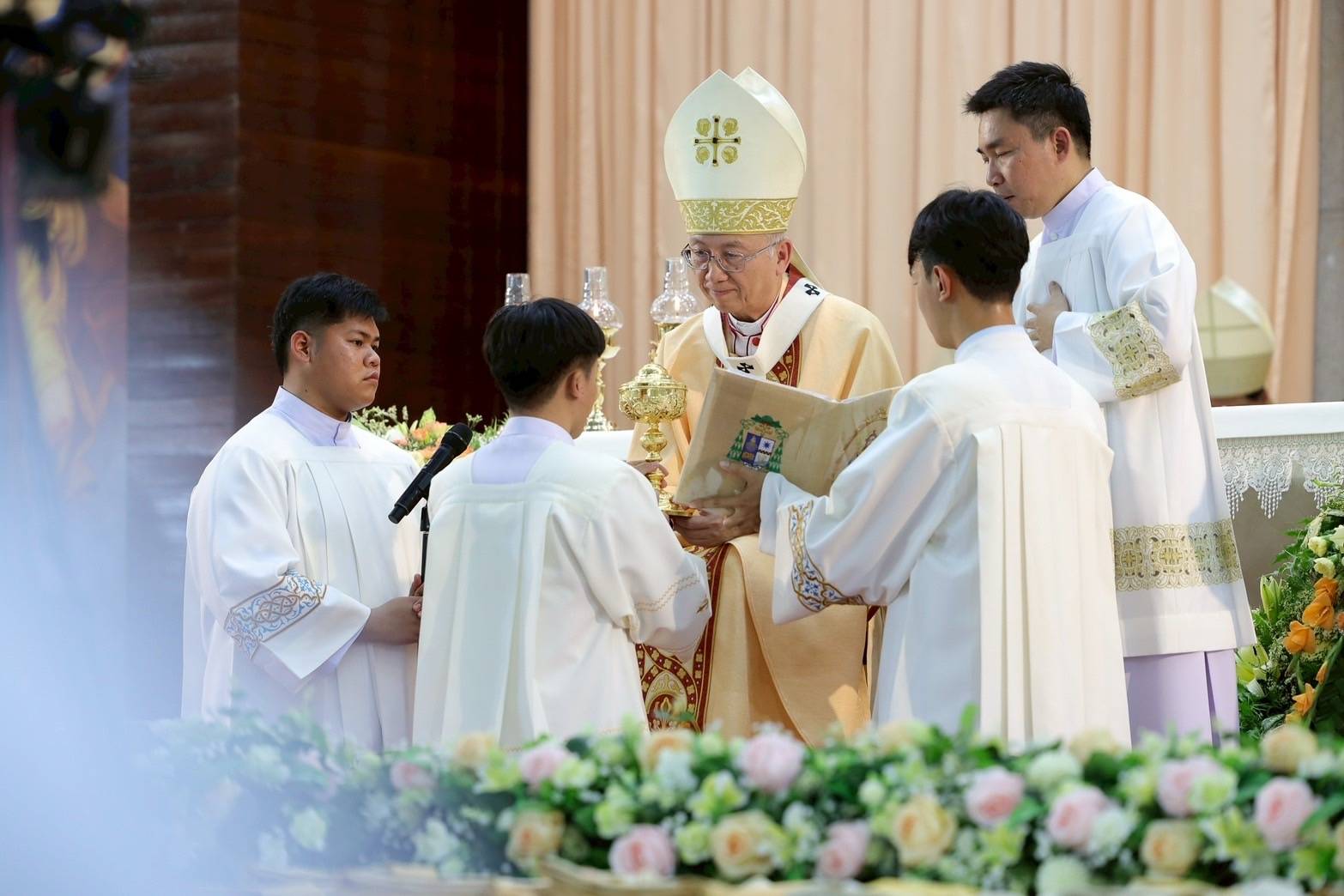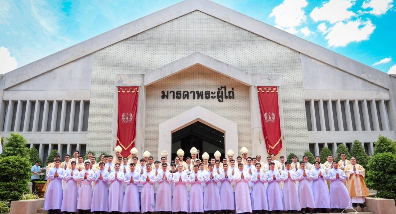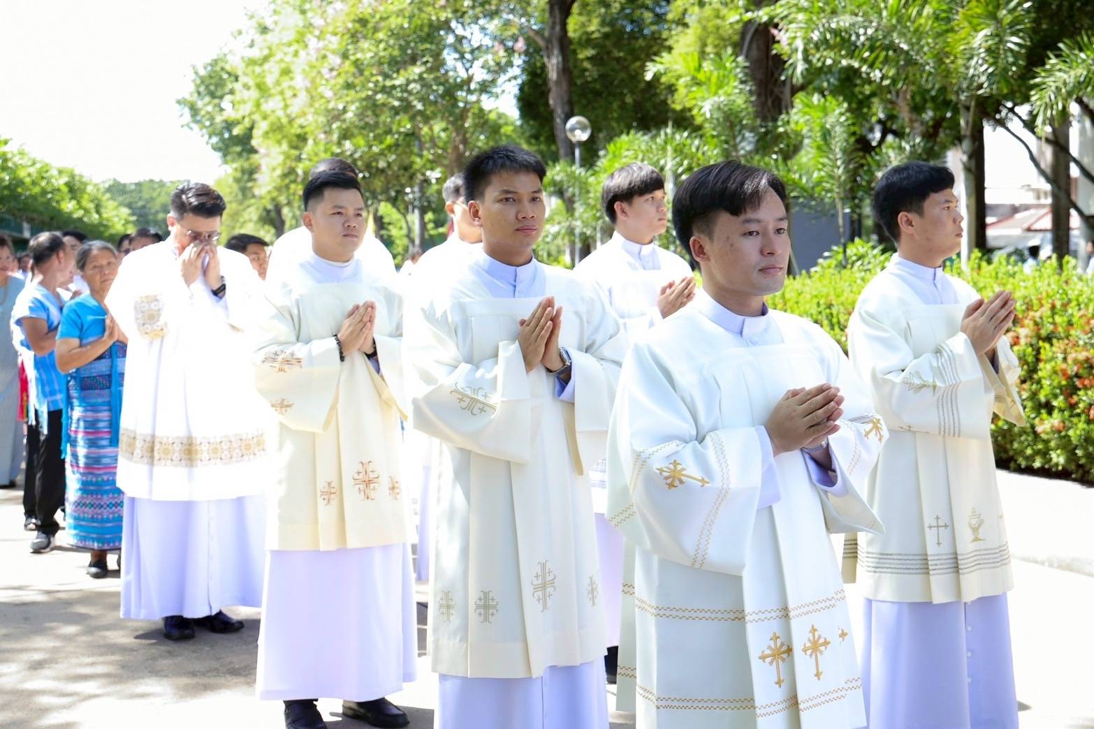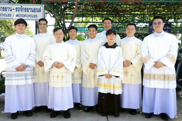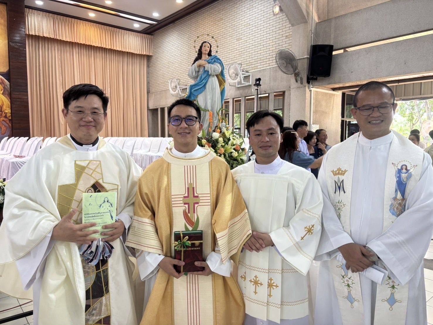 ภาพพิธีบวชสังฆานุกร และแต่งตั้งผู้ช่วยพิธีกรรมของ สามเณรสเตฟน พิรุณ แซ่จัง รับศีลบวชเป็นสังฆานุกร สามเณรเปโตร มอแล คะหล่า รับแต่งตั้งเป็นผู้ช่วยพิธีกรรม โดยพระอัครสังฆราชฟรังซิสเซเวียร์ วีระ อาภรณ์รัตน์ ประมุขอัครสังฆมณฑลกรุงเทพ วันเสาร์ที่ 9 สิงหาคม ค.ศ. 2025 เวลา 10:00 น. ณ อาคารพระมารดาพระผู้ไถ่ บ้านเณรใหญ่แสงธรรม