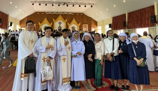 สำหรับอาสนวิหารที่กรุงพนมเปญ ได้เริ่มงานเตรียมพื้นที่สำหรับเพิ่มเติมในส่วนของถนนและระบบระบายน้ำรอบวัด ระยะนี้ฝนตกมากเรามีปัญหาเรื่องที่เก็บน้ำแก้มลิง ซึ่งน้ำเคยไปรวมตรงที่ก่อสร้างวัดใหม่ ตอนนี้บริเวณนั้นได้ยกสูงขึ้นแล้ว ทำให้น้ำไปร่วมในบริเวณเขตอาคารเก่า ล่าสุดได้ท่วมเข้ามาในห้องทำงาน และตัวอาคาร ซึ่งมีข้าวของเสียหายไปพอสมควร เราต้องคิดจัดระบบระบายน้ำใหม่ ส่วนงานในตัวอาคาร ก็กำลังเริ่มเก็บงานเพดาน และราวบันไดต่างๆ และงานสีบางส่วนได้ทาบ้างแล้ว พร้อมกับเตรียมช่องสำหรับ ใส่ระฆังต่อไปในอนาคตครับ