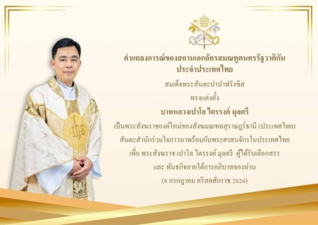 สวัสดีครับพี่น้อง ในช่วงระยะเวลานี้ หลายสังฆมณฑลในประเทศไทยเรา กำลังแสวงหาประมุขสังฆมณฑลกันหลายแห่ง ที่เห็นว่ากำลังรออยู่ ก็มีที่อัครสังฆมณฑลกรุงเทพฯ และสังฆมณฑลจันทบุรี เพราะวันที่ผมเริ่มเขียนบทความนี้ คือวันที่ 8 กรกฎาคม 2024 วันที่คณะธรรมทูตไทย ต้องบันทึกประวัติศาสตร์ไว้อีกหน้าหนึ่ง เพราะอธิการคณะธรรมทูตไทย คือ คพ.เปาโล ไตรรงค์ มุลตรี ได้รับการแต่งตั้งจากพระสันตะปาปา ให้เป็นพระสังฆราชของสังฆมณฑลสุราษฎร์ธานี