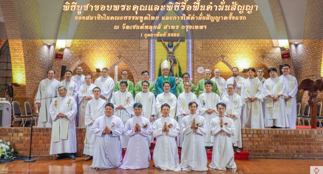 ข่าวกิจกรรมคณะ พิธีบูชาขอบพระคุณและพิธีรื้อฟื้นคำมั่นสัญญา ของสมาชิกในคณะธรรมฑูตไทย BY admin@admin.com 02/03/2026 0 Comments 7 Views พิธีบูชาขอบพระคุณและพิธีรื้อฟื้นคำมั่นสัญญา ของสมาชิกในคณะธรรมฑูตไทย และการให้คำมั่นสัญญาครั้งแรก ณ วัดเซนต์หลุยส์ สาทร กรุงเทพฯ 1 กุมภาพันธ์ 2026 ดูภาพทั้งหมดจากแหล่งข้อมูล