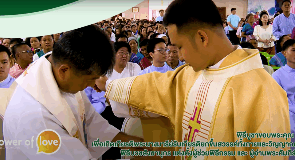 รายการ Power of Love พลังรัก สร้างพลังคุณ ในตอนนี้ ขอพาทุกท่านไปสัมผัสบรรยากาศอันศักดิ์สิทธิ์และเปี่ยมด้วยพระหรรษทาน พิธีบูชาขอบพระคุณ เพื่อเทิดเกียรติพระนางมารีย์ ผู้ได้รับเกียรติยกขึ้นสวรรค์ทั้งกายและวิญญาณ พร้อมทั้งพิธีบวชสังฆานุกร การแต่งตั้งผู้ช่วยพิธีกรรม และผู้อ่านพระคัมภีร์ ซึ่งเป็นอีกหนึ่งช่วงเวลาแห่งพระพร ที่สะท้อนถึงการมอบชีวิตเพื่อการรับใช้พระเจ้า โดยพระอัครสังฆราชฟรังซิสเซเวียร์ วีระ อาภรณ์รัตน์ ประมุขอัครสังฆมณฑลกรุงเทพฯ จัดขึ้นในวันเสาร์ที่ 9 สิงหาคม ค.ศ. 2025 ณ อาคารมารดาพระผู้ไถ่ บ้านเณรใหญ่แสงธรรม สามพราน จังหวัดนครปฐม บรรยากาศเต็มไปด้วยความเชื่อ ความรัก และความศรัทธาของบรรดาผู้ร่วมพิธี ที่มาร่วมเป็นพยานแห่งชีวิตใหม่ของผู้รับใช้พระเจ้า และการยกเกียรติแด่พระมารดาพระผู้ไถ่